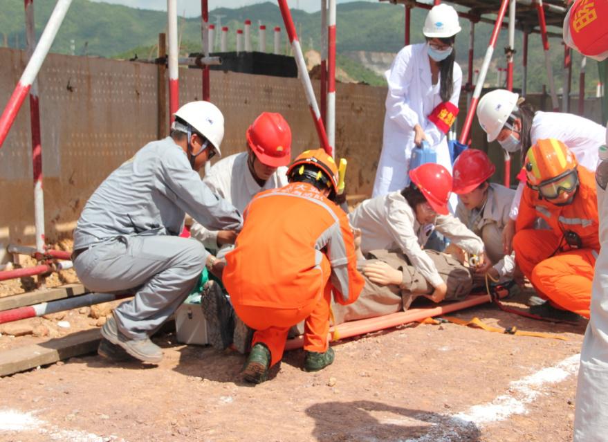 演練場景為硫磺庫棚東側腳手架有一人在約4米高處觸電后從高處墜落。發現事故后,項目部安全監護人員及時上報,現場專職安全員劉占洋撥打救援電話,并上報應急總指揮??傊笓]齊少華啟動項目部“1號應急預案”。應急救援組李小蘭、王亞萌等進行傷者救護,安全保障組張小民組織緊急集合,后勤保障組彭井恩帶隊進行警戒圍護,季信軍、高鐵騎救護車輛指引。應急小組分工明確,各司其職,救援、警戒、緊急集合同時進行,傷者救護在10分鐘內將傷者送往醫院救治。