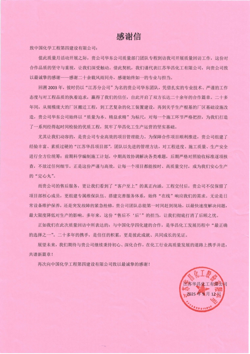 近日,在全國(guó)“質(zhì)量月”活動(dòng)開展之際,華東公司收到江蘇華昌化工有限公司發(fā)來(lái)的感謝信。這份滿載認(rèn)可的信函,不僅是合作方對(duì)華東公司質(zhì)量管理工作的高度肯定,更成為雙方20余載風(fēng)雨同舟、攜手共進(jìn)的深厚合作情誼的生動(dòng)見證。