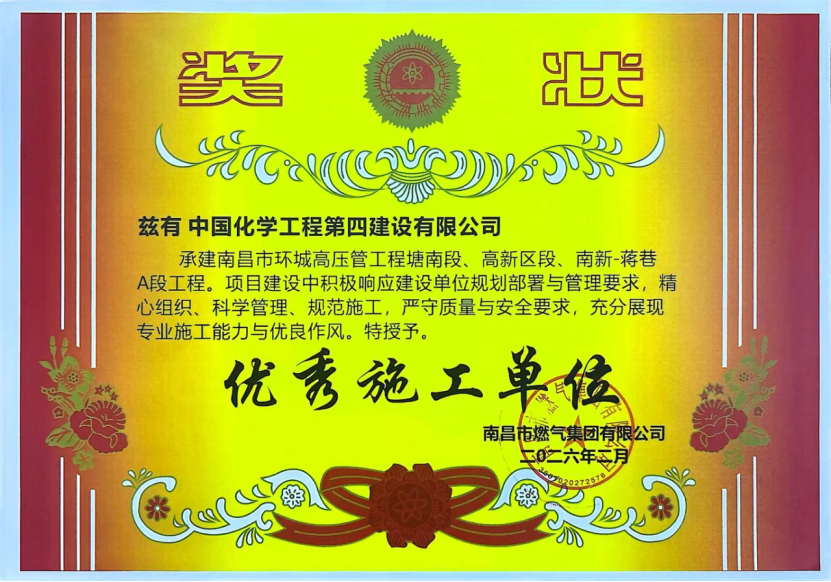 近日,由華北公司承建的南昌市環城高壓管工程塘南段、高新區段、南新-蔣巷A段等三個標段,被南昌市燃氣集團有限公司授予“優秀施工單位”榮譽稱號。